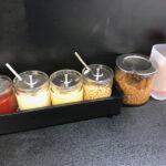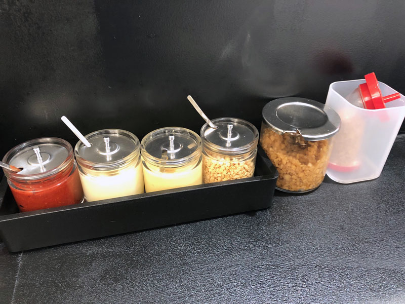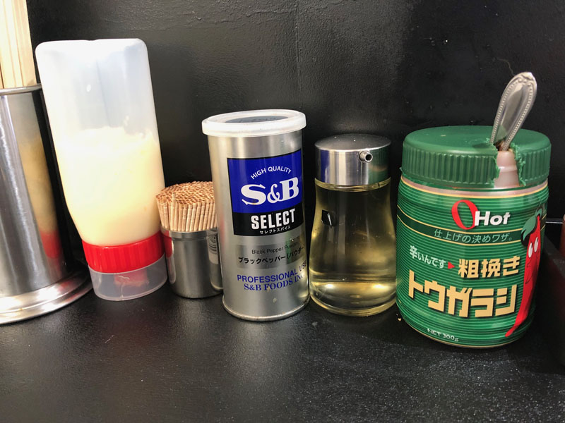 調味料は豊富です。ニンニクもフライドの他に「刻み」「おろし」の3種。唐辛子系も2種。お酢、すり胡麻、おろし生姜、ブラックペッパー、マヨネーズ。メニューにご飯ものも数種あるので味変アイテムが多いのかも?「竜」さんにも店外にメニューがあり初見には親切設計。