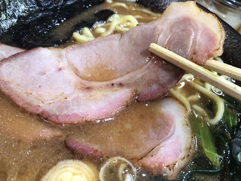 チャーシューはロースで薄めのスライスが2枚。正真正銘w の焼き豚で香ばしい。
