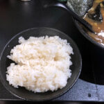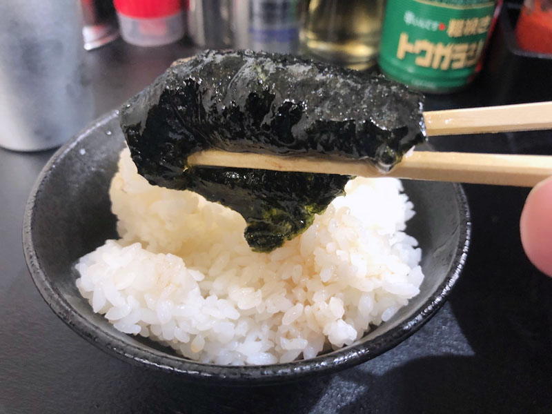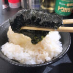 途中でライスを追加して海苔巻きに・・・やはり家系はコレしないとねw ん~~~濃いめのスープを吸った海苔とライスがベストマッチ!ウマウマ。途中でフライドガーリック?を入れてみた。少し味変。スープが強いのでもう少し入れた方が良かったかも?
